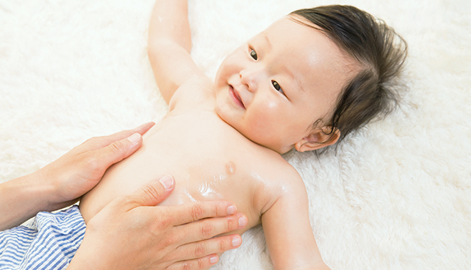 汗を拭いたりキレイにしたりすると、どうしても肌の乾燥は奪われていきます。汗の処理をしたあとは、忘れずに保湿ケアを行いましょう。保湿剤はたっぷり使い、こすらずに一方向にすーっと伸ばします。首のシワや関節部分のくびれなども忘れずに。保湿ケアをすることでうるおいを補給するだけでなく、汗の刺激が肌に直接つくのを防ぐことにもなります。