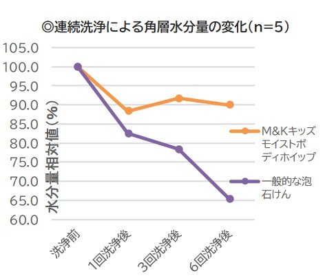 一般的な泡石けんに比べ、水分量の低下が少なく、洗浄力がマイルドであることがわかりました。