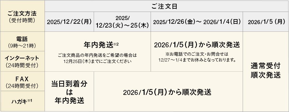年内の発送をご希望の方は、 お電話でのご注文がより確実です。