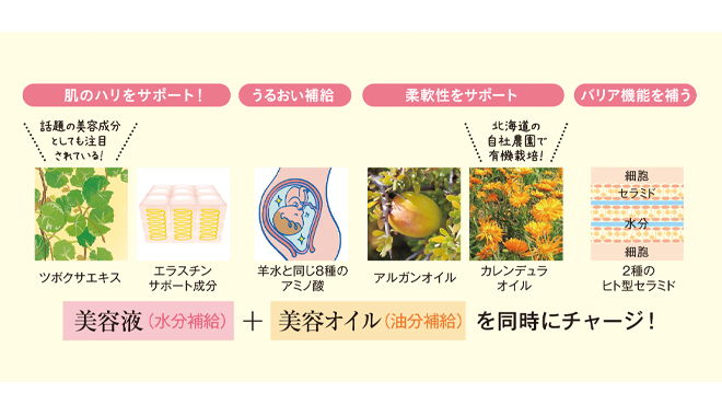 乾燥した肌は、水分も油分も不足しています。この状態を改善するには、足りない水分も油分もしっかり補給することが大切。しかし、オイルは当然ながらほとんど油分でできています