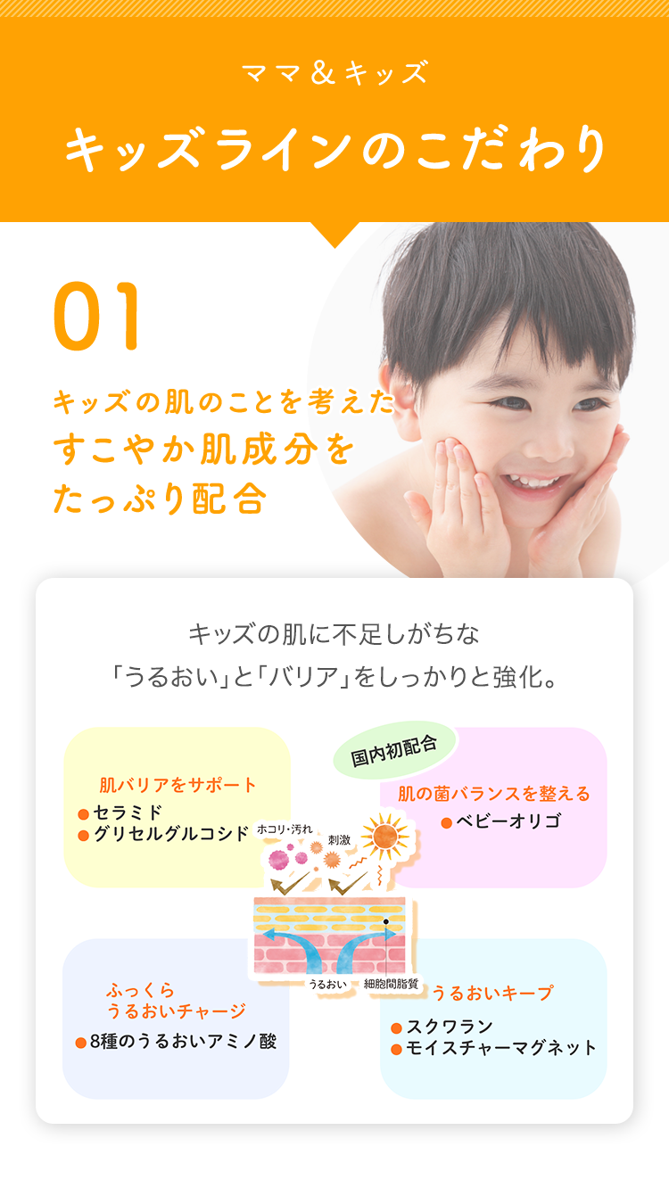 ママ&キッズキッズラインのこだわり 01 キッズの肌のことを考えたすこやか肌成分をたっぷり配合 キッズの肌に不足しがちな「うるおい」と「バリア」をしっかりと強化。 02 小児科・皮膚科医・アレルギー科医協力のもと開発した独自処方 03キッズが嫌がらずにケアできる使い心地