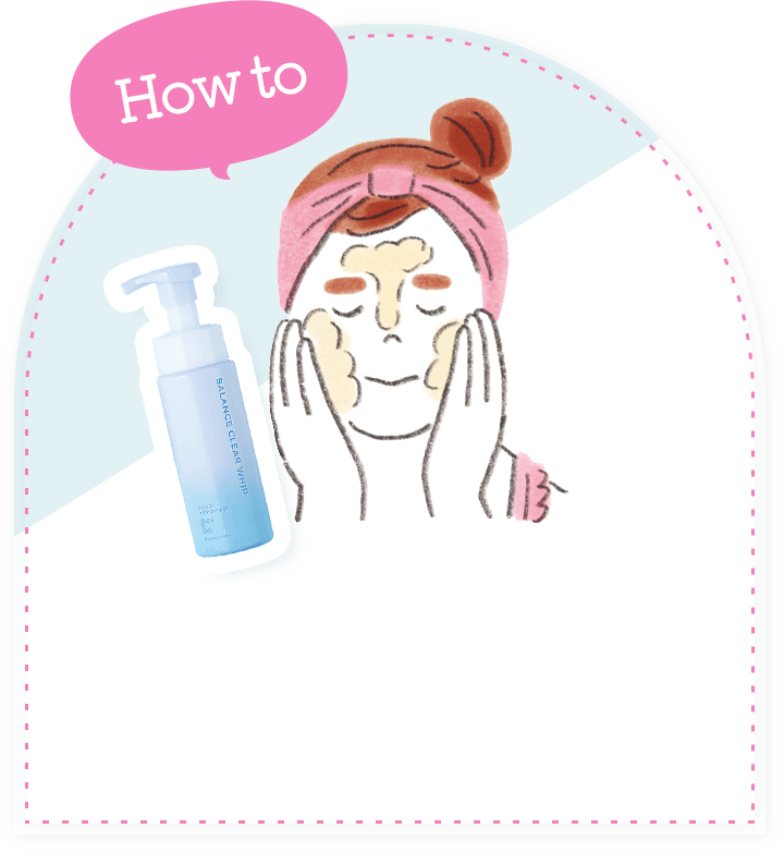手のひらに6プッシュ程度とった後、Tゾーンにテニスボール大の泡を置き、らせんを描くように洗いながら顔全体へ。皮膚の薄い目元は最後に洗って。