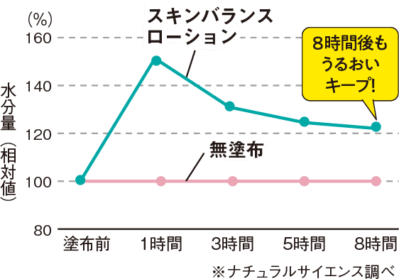 肌内部の水分量を高めるとともに、蓄えた保湿成分を長時間とどめ、うるおいを持続させます。