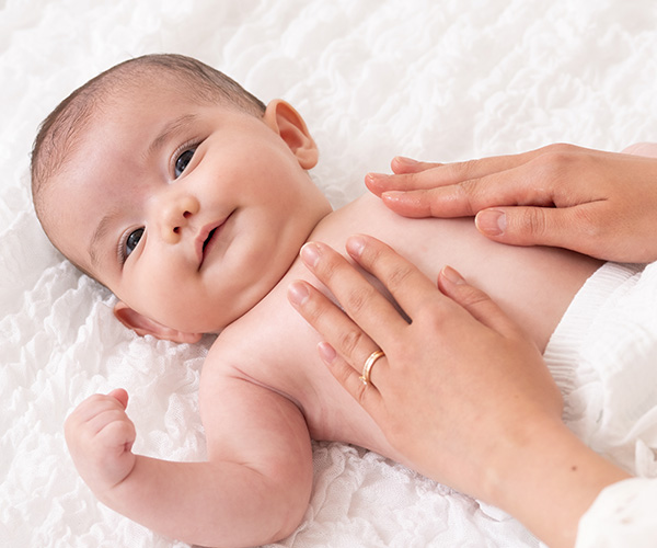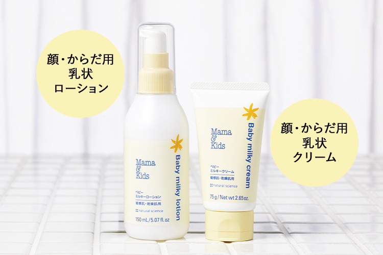 生まれたときから使えるよう、赤ちゃんの肌に必要な成分だけを配合した乳状ローション。さらっとなじんでベタつかず、なめらかな使い心地です。