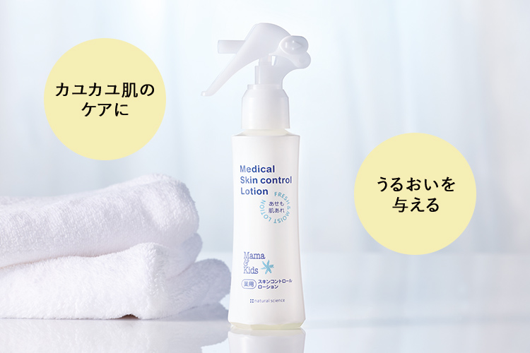 汗かき、ベタつき、あせもに薬用スキンコントロールローションでケアを。モモの葉エキス、クララエキスが、肌のムレや汗でのムズムズをさわやかに整え、うるおします。