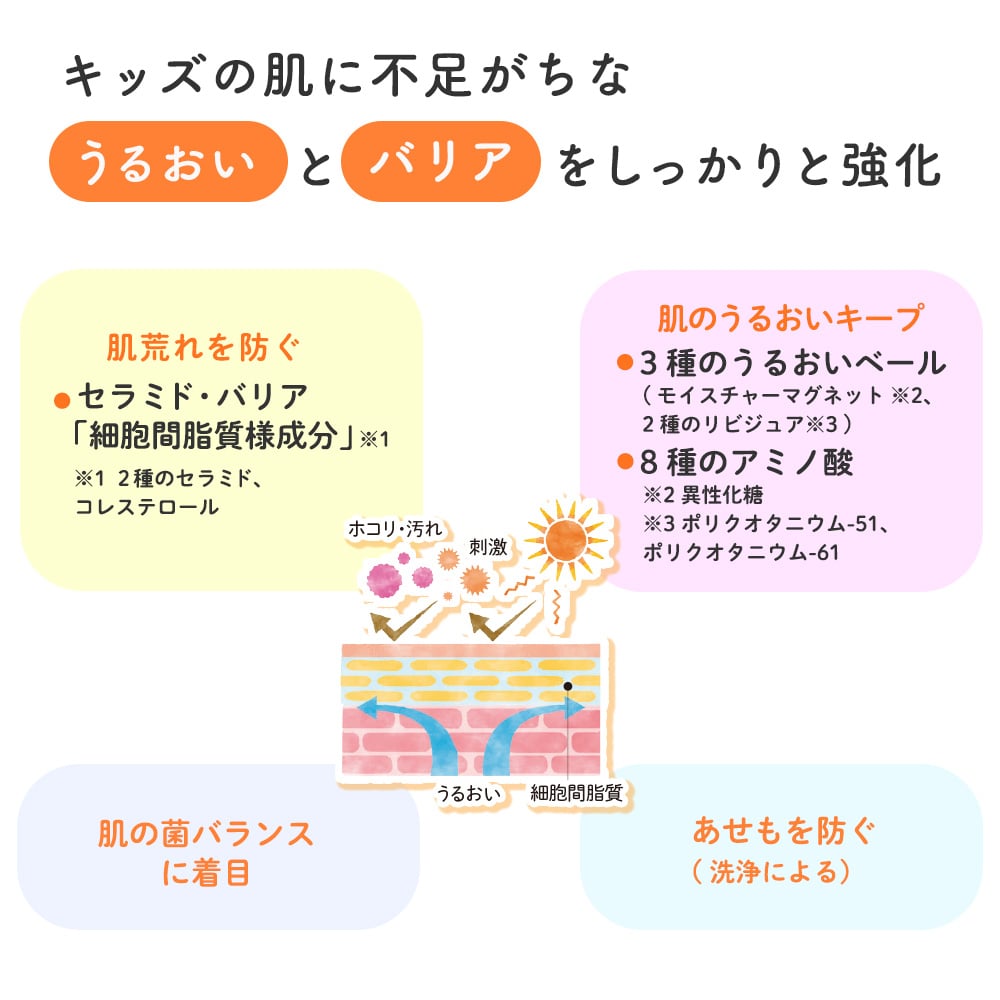 ※「ママ&キッズ キッズライン」は3歳すぎ~思春期前までのお子さまのための成長途中の肌のためのスキンケアラインです。0~3歳のお子さまには、赤ちゃんの未熟な肌を考えた「ベビーライン」がおすすめです。
