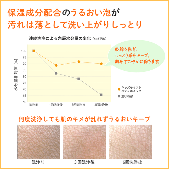 汚れやすいのに乾燥してデリケートなキッズの肌をやさしくきれいに洗います。目にしみにくい弱酸性アミノ酸タイプで泡切れも抜群。モコモコの泡が出て、キッズが自分で顔や体をきちんと洗いやすいタイプです。