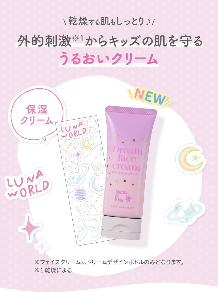 紫外線や乾燥、大気汚染、ブルーライト、睡眠不足やストレスなど、さまざまな刺激を受ける 子どもたち・敏感肌の肌をうるおいとバリアで守り、肌荒れを防ぎながら、肌をはぐくむフェイスクリーム。 なめらかでのびがよく、べたつかず、子どもたちが自分で使いやすい使い心地にこだわりました。