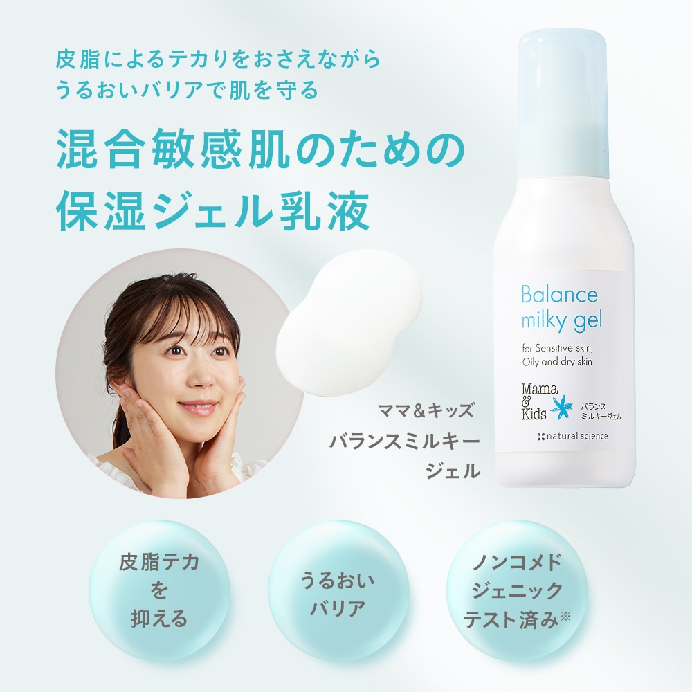 「バランスミルキージェル」は、ノンコメドジェニック処方※でお作りしております。ニキビになりにくい処方です。ニキビができやすい混合敏感肌の方に特におすすめです。ぜひ、「ママ&キッズ 敏感バランスライン」のほかの製品も合わせてお使いください。