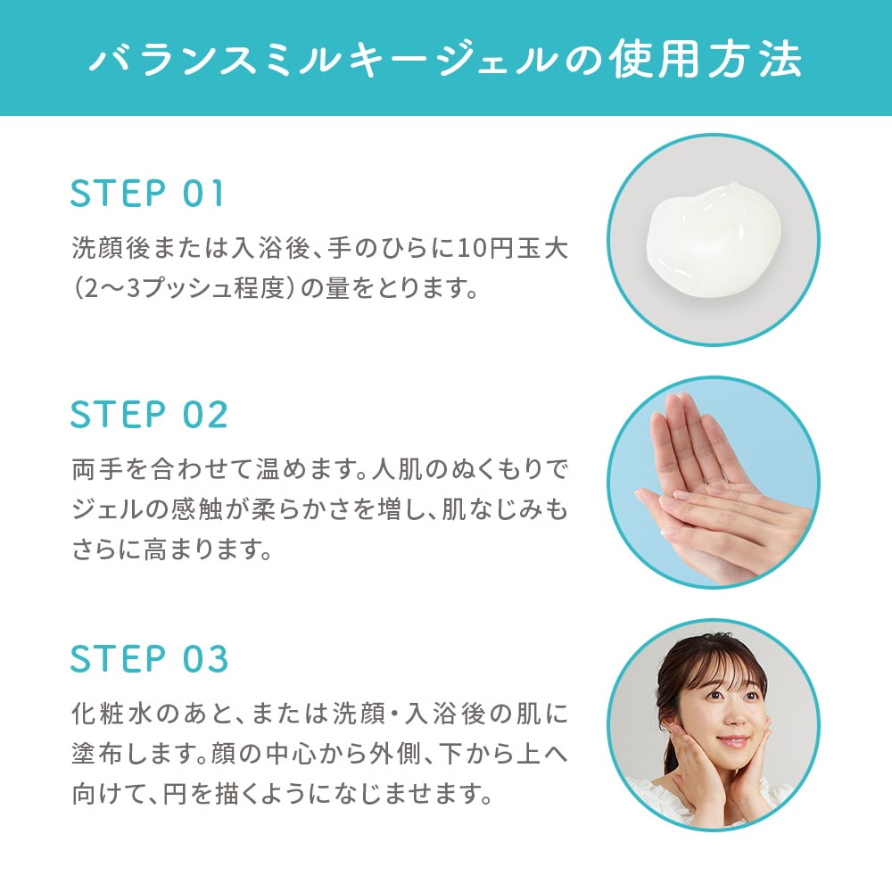 「バランスミルキージェル」は洗顔後に化粧水→美容液→バランスミルキージェル→ポイントケアやクリームなど、の順にお使いください。