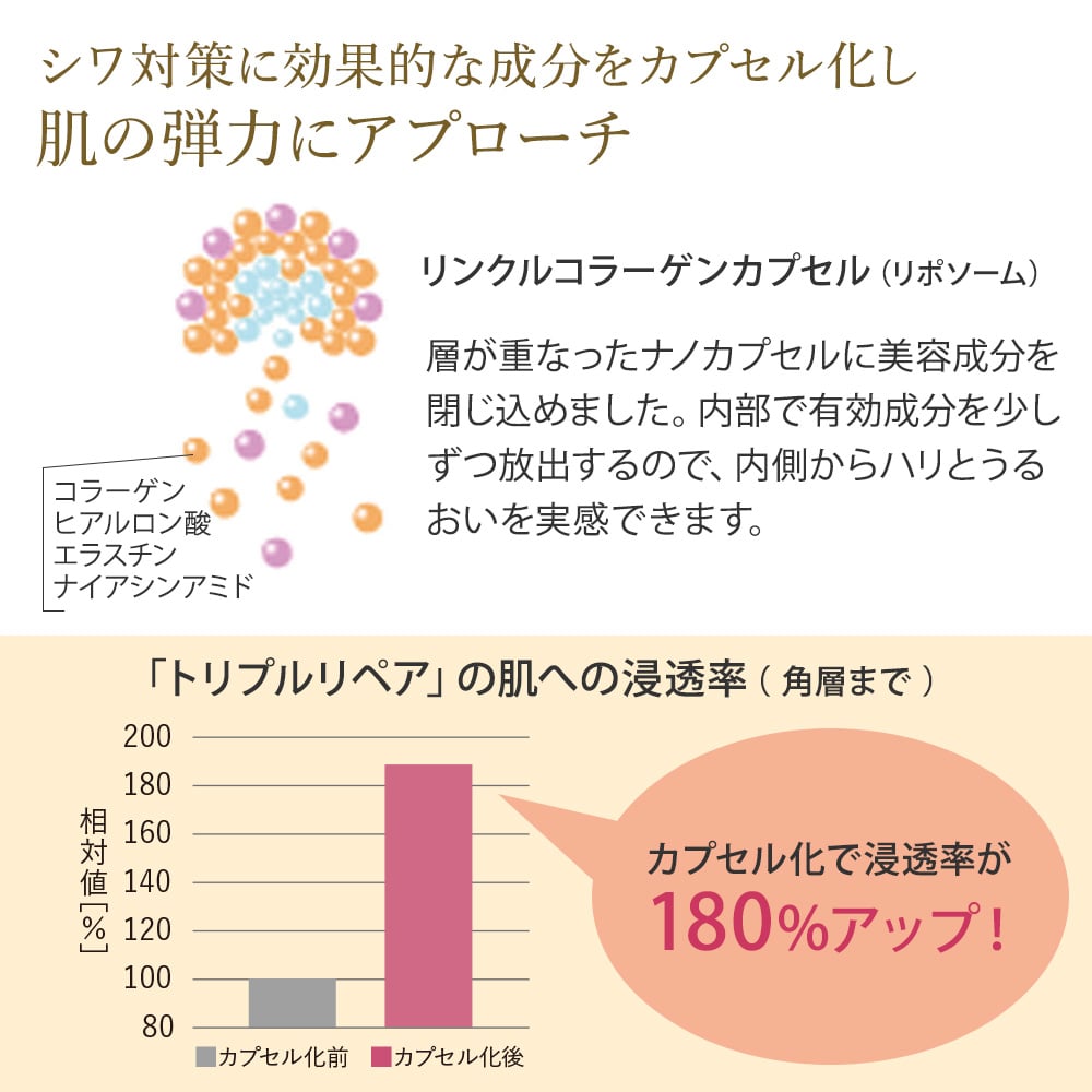 キメ乱れによるくすみにアプローチし、紫外線による乾燥、外的ストレスによる刺激からの保護にトータルアプローチ。コラーゲンやエラスチン、ナイアシンアミドなどの美容成分を多重層マイクロカプセルに閉じ込めた、リッチなエイジングケア※1美容液です。軽いつけ心地で角層内まで浸透するので、もっちりと弾むようなハリとツヤを与え、透明感※2あふれる肌に整えます。また、容器は環境へのやさしさと衛生面を考えたつけ替え容器を採用しています。※1 年齢に応じた化粧品等によるケア